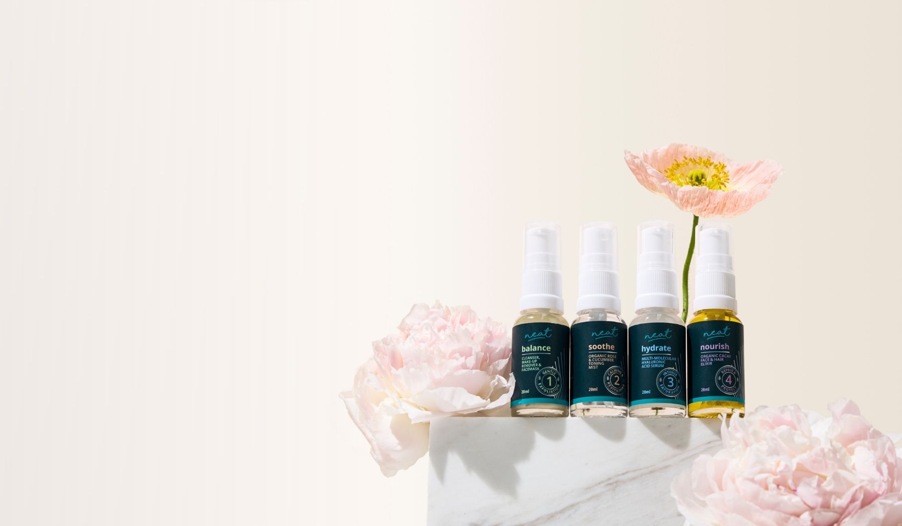 I am 50, and I have always had terribly dry skin on my face. I've tried so many different products and ranges but they would either not work or were just too expensive for me to continue buying. Until, I tried Neat earlier this year. I started with this mini set and I couldn't believe how good my skin looked and felt straight away. It was so quick and easy to use and I was hooked!! I then bought the bigger bottles in all 4 products as well as the night oil. This new mini set i have just bought is for travelling. My skin is no longer dry and apparently I look younger.