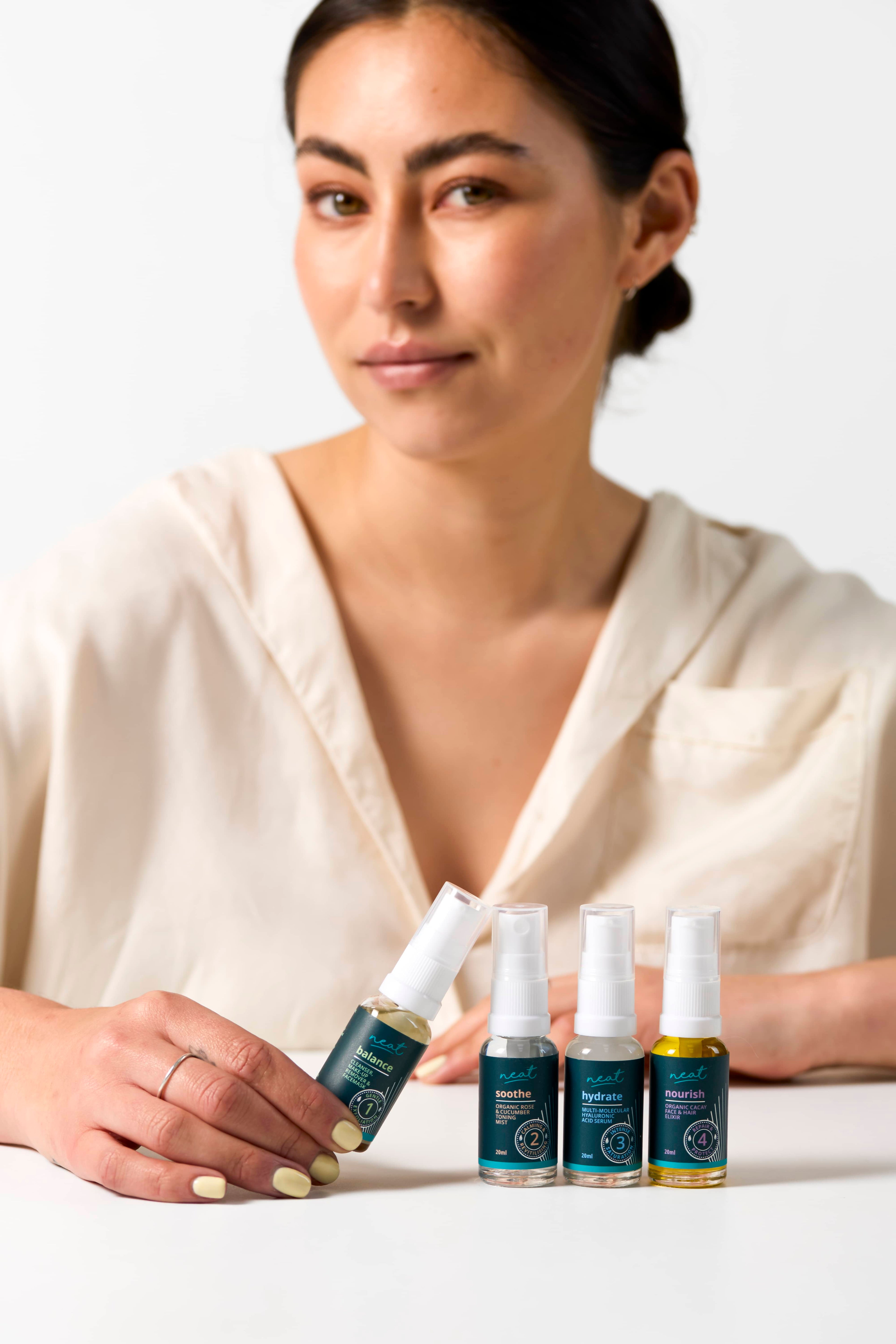 Our Mini Skincare Sets deliver everything you need for a simple daily routine — cleanse, tone, hydrate, and nourish — with the option to add our Night Oil for a powerful overnight treatment.